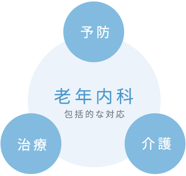 具体的には、高齢者の生活の質をできるだけ長く保つために、予防、治療、そして介護といった幅広い問題を総合的に考慮した医療を提供しています。